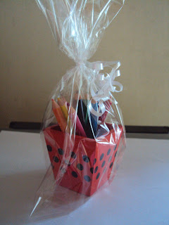 A lembrancinha inclui o cachepô, os lápis, a embalagem e a tag (com nome e data).
