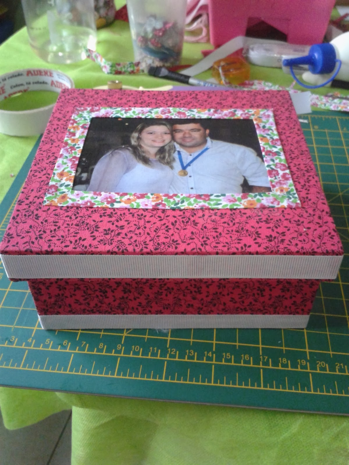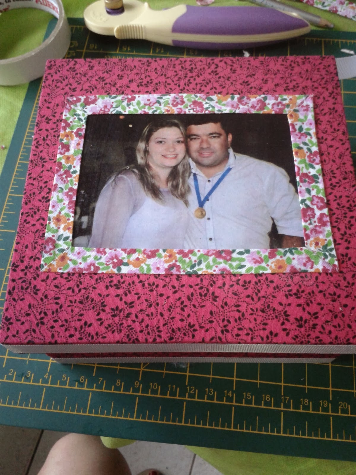 uma caixa de mdf, revestida com tecido e com decoupagem de foto.