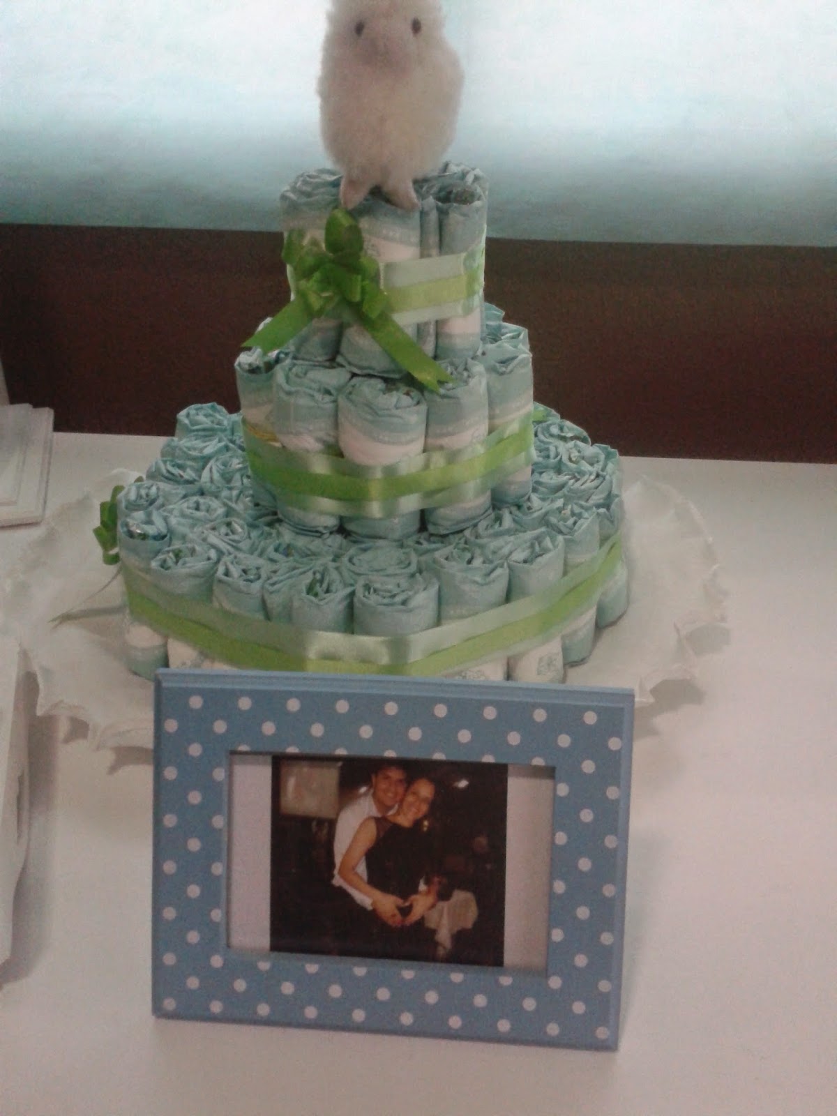 O tradicional bolo de fraldas com um lindo carneirinho no topo |