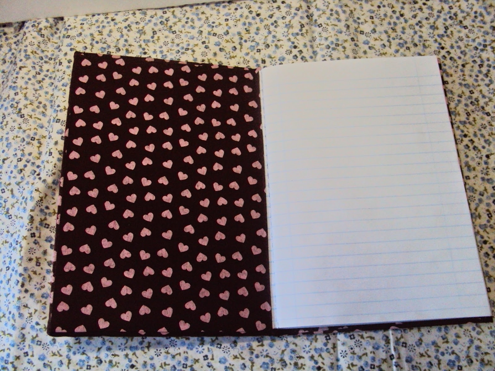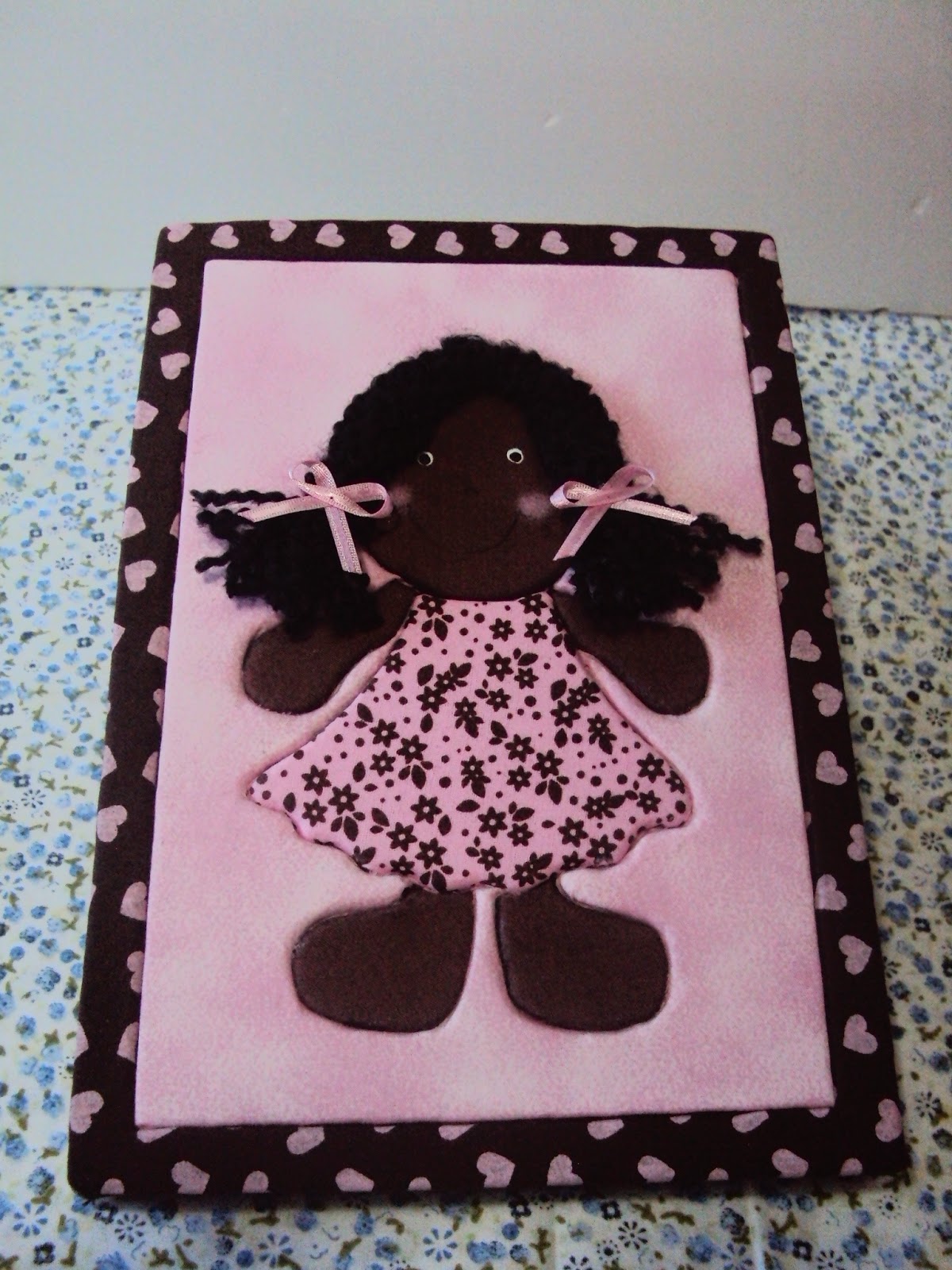 Um caderno decorado com uma boneca que fosse negra e com tecidos rosa e marrom.